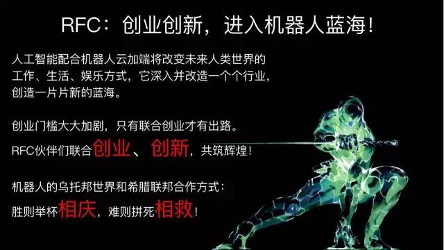 隨著創(chuàng)業(yè)門檻大大加劇,只有聯(lián)合創(chuàng)業(yè)才有出路,RFC伙伴們聯(lián)合創(chuàng)業(yè),創(chuàng)新,一起共筑輝煌!我們崇尚機(jī)器人的烏托邦世界和希臘聯(lián)邦合作方式:勝則舉杯相慶,難則拼死相救!