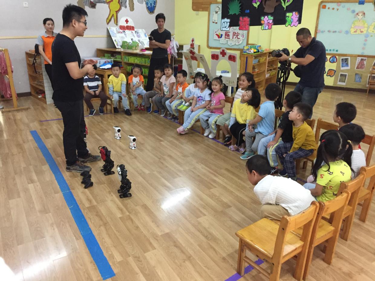 木牛流馬機器人科技公司的CEO張寧介紹說,這些機器人中有的可以和小朋友們交流,有的可以展示炫酷動感的舞蹈。他正說著,小朋友們就高興地叫了出來。