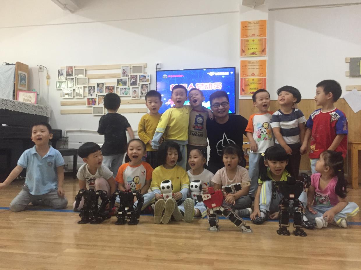 小朋友們珍惜地抱著彭彭樂樂不肯放開。最后木牛流馬機器人科技公司的CEO張寧與小朋友們一起合了影。